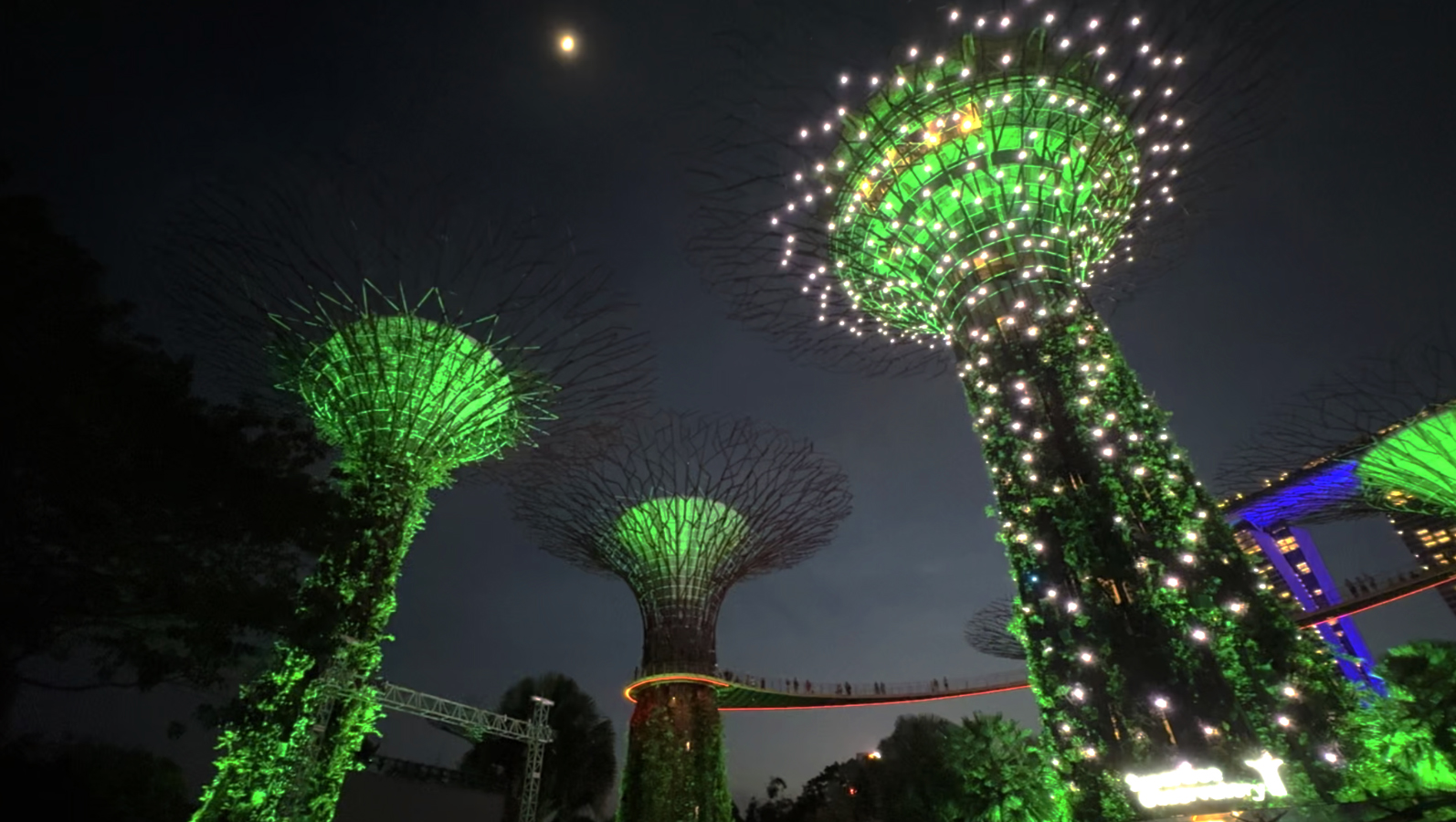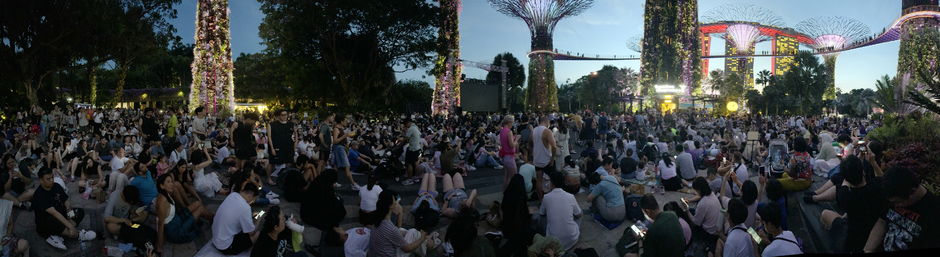This panorama (scroll right to see it all) gives some impression both of the size of the SuperTrees and of the crowd that assembled on both nights when we were there to see the light show.