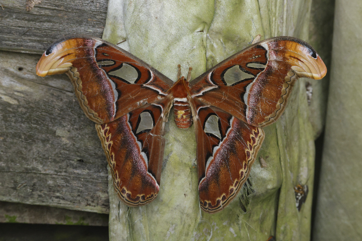 This Atlas moth (Attacus atlas) with wing span of about 10 inches was the most most impressive. Quoting the the California Academy of Sciences, "An Atlas moth rests on a tree trunk with its wings closed. A bird, hoping for a snack, creeps closer, until it's within striking distance. Just as it’s about to pounce, the moth’s wings spring open—and bam! Instead of a moth, the bird suddenly sees not one, but two snake heads. Confused and startled, the bird flies away —- and the moth gets to live another day. ... Atlas moths are most famous for the markings on the upper corner of their wings, which bear an uncanny resemblance to cobra heads in profile. While not all entomologists are convinced of that visual mimicry, there is some convincing evidence. Cobras live in the same part of the world as these moths, and the moth’s main predators —- birds and lizards —- are visual hunters. Plus, species related to the Atlas moth have similar but less defined versions of the snake’s head, showing a pattern that could have been fine-tuned by natural selection."