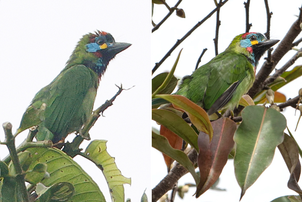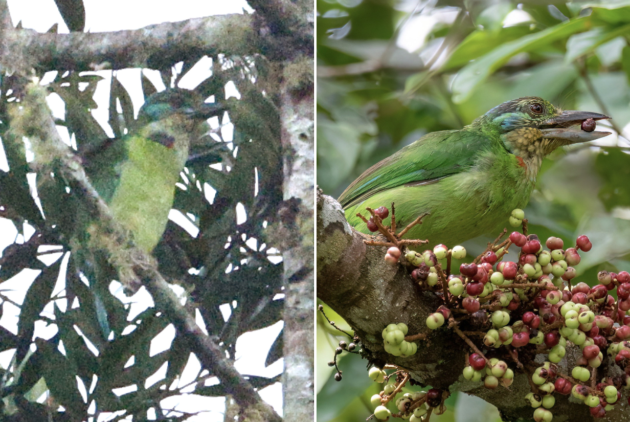 Bornean barbet ... also far away. For comparison, the right-hand panel shows a picture from ebird. This is my life bird.